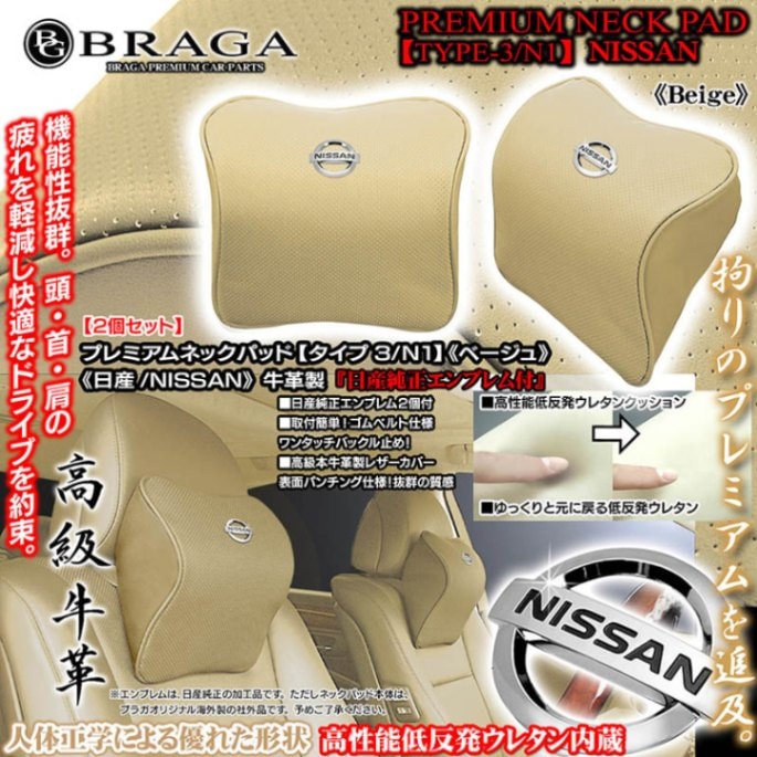 日産純正メッキエンブレム付《タイプ3/N1》プレミアムネックパッド【ベージュ/2個】低反発ウレタン内蔵/牛革製パンチングレザー/ブ...