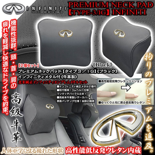 純正インフィニティエンブレム付《タイプ3/IG》プレミアムネックパッド【ブラック/2個】低反発ウレタン内蔵/牛革製パンチングレザー...