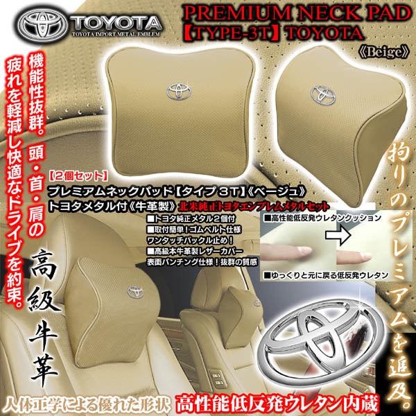 純正トヨタメタル付《タイプ3T》プレミアムネックパッド【ベージュ/2個セット】低反発ウレタン内蔵/本牛革製パンチングレザー/ブラガ