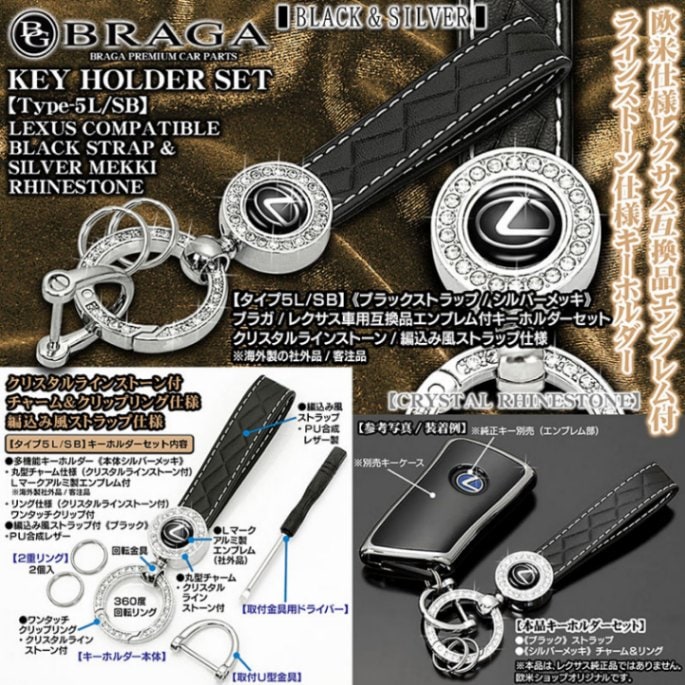 [タイプ5L/SB]レクサス 互換品エンブレム付 客注品 キーホルダー シルバーメッキ&ブラック 合皮製ストラップ ラインストーン...