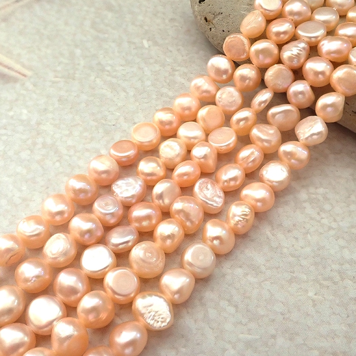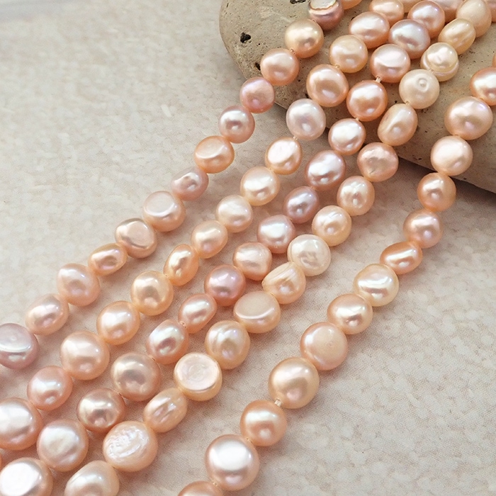 【有核 淡水真珠 約7.5×6.5mm】ピーチ系 セミラウンド 天然パールビーズ 約35cm連 ハンドメイド用