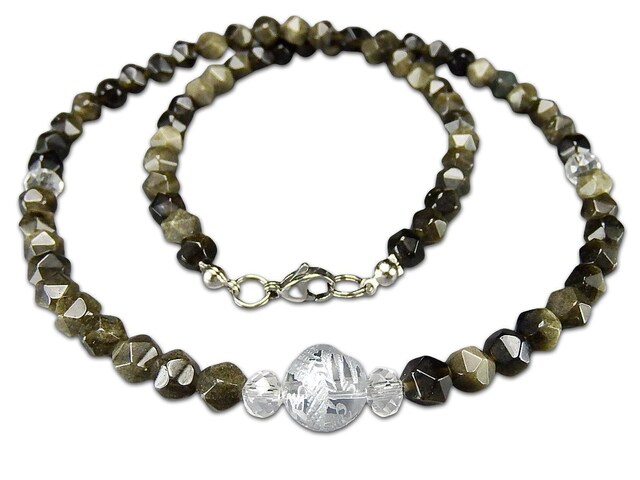 オシャレゴールドオブシディアン三角カット約6mm水晶銀龍手彫り天然石ワイヤー仕上げネックレス