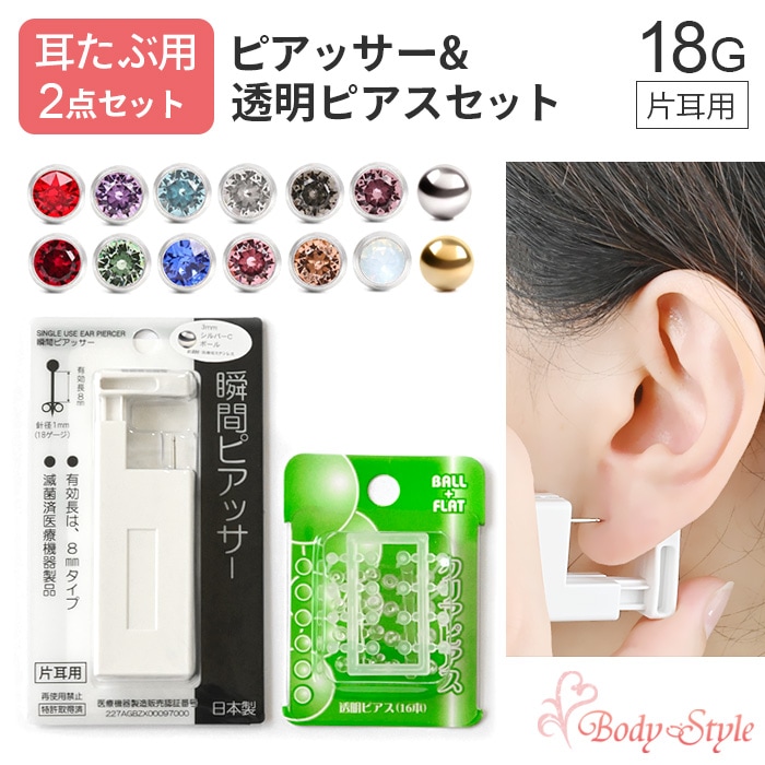 【片耳用ピアッサー&消毒ジェル&透明ピアス】ピアッサー 3点セット 耳たぶ用 18G 片耳用 金属アレルギー対応 日本製 医療用ス...
