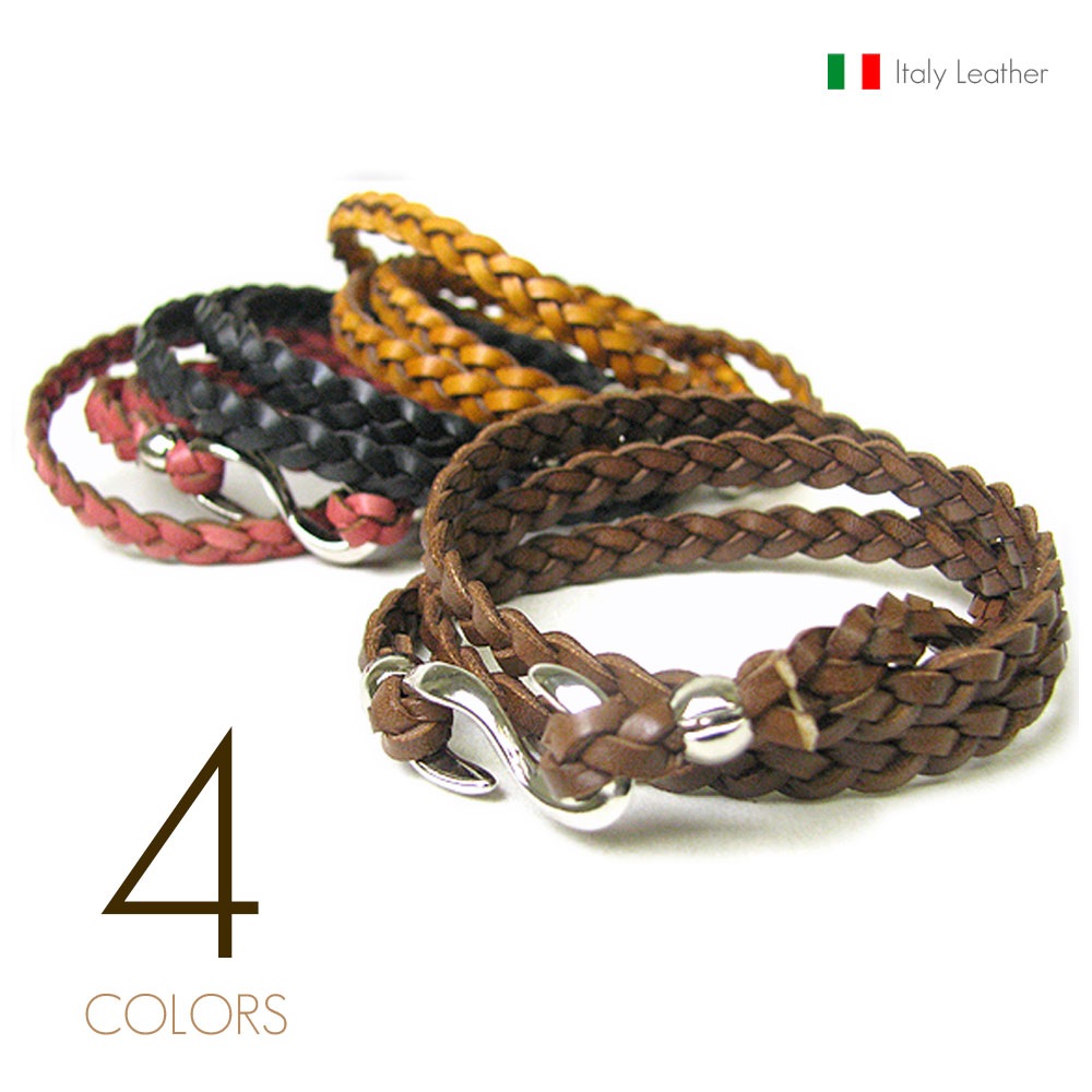 イタリアンPUレザー三つ編み仕上げ(全4色) 鏡面S字フック 三重巻き ロング レザーブレスレット 【革 三連 レザーブレスレット...