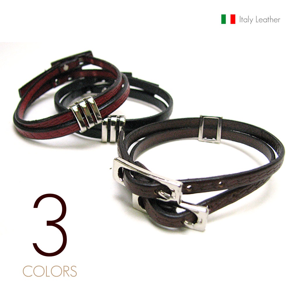 5mm幅 イタリアンレザー (牛革) デザインエンボス ダブル仕様 イタリア製ツインバックル 2連レザーブレスレット 【革 ブレス...