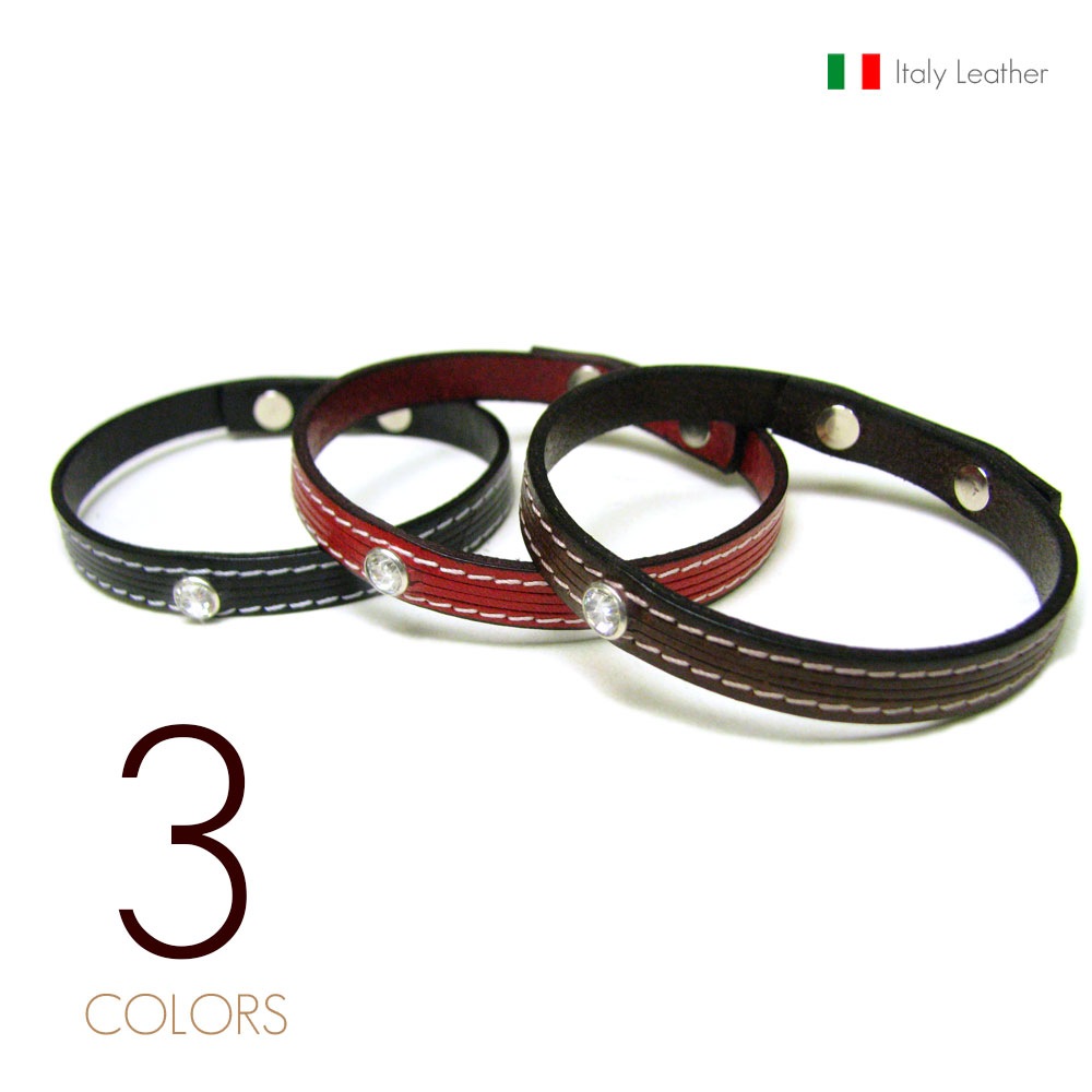 8mmイタリアンレザー (牛革) ダブルステッチ ラインエンボス仕上げ スワロフスキーポイント 2段階サイズ調整 レザーブレスレ...