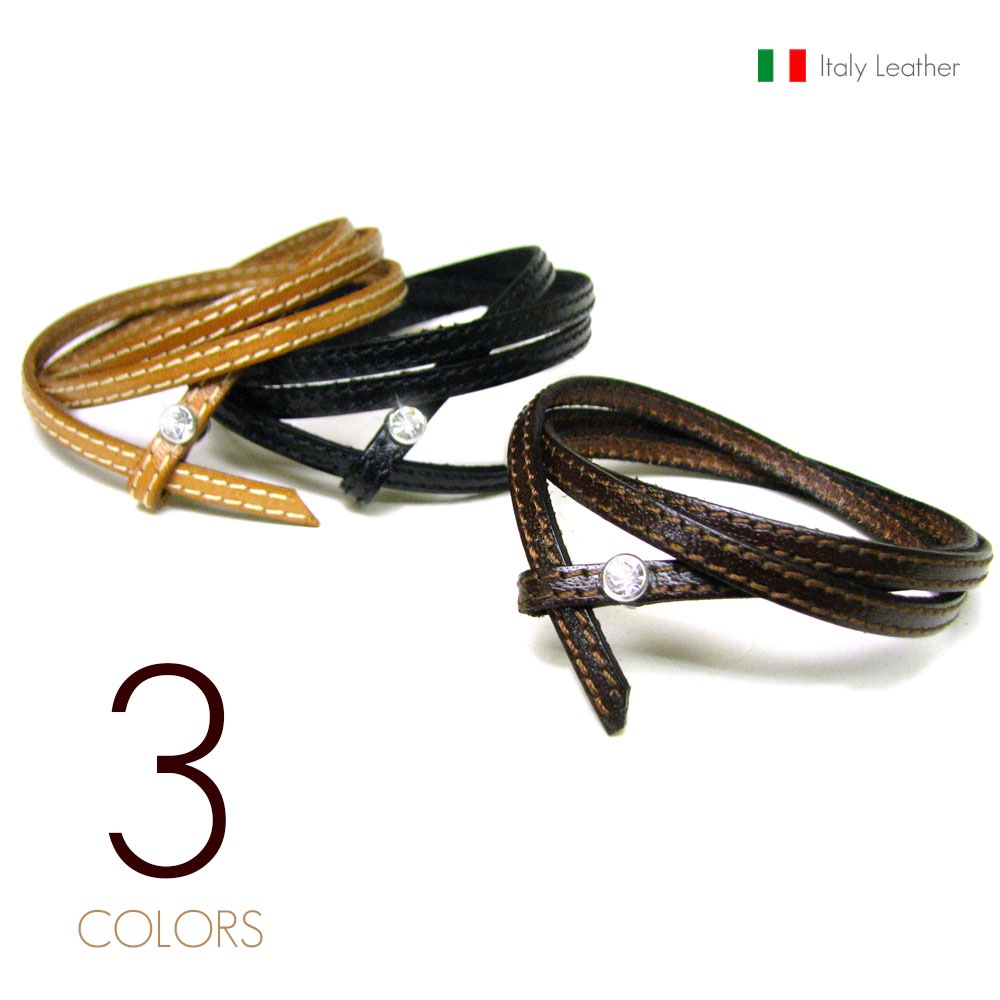 5mmイタリアンレザー (牛革) ダブルステッチ仕上げ スワロフスキーポイント 3重巻き 差し込み式サイズフリー レザーブレスレ...
