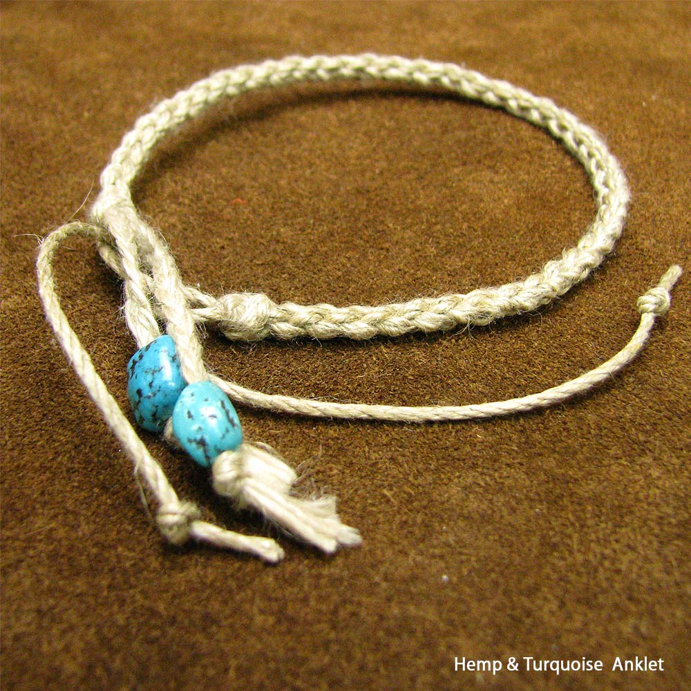 天然ターコイズエンド仕上げ ヘンプ(麻)編み込み アンクレット【メンズ/レディース両対応】
