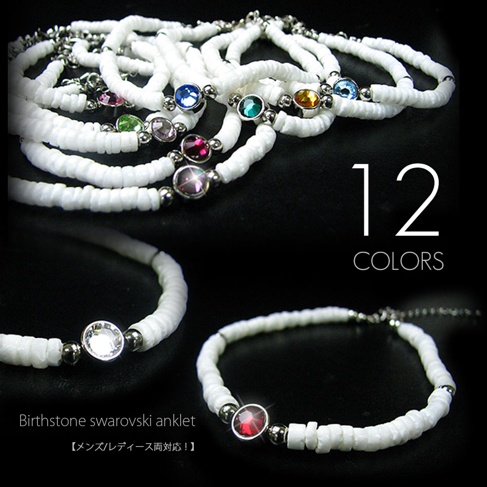 ハワイアンホワイトシェル(白ヒーシー) 誕生石スワロフスキー(全12種類) アジャスター付きアンクレット【メンズ/レディース両対応...