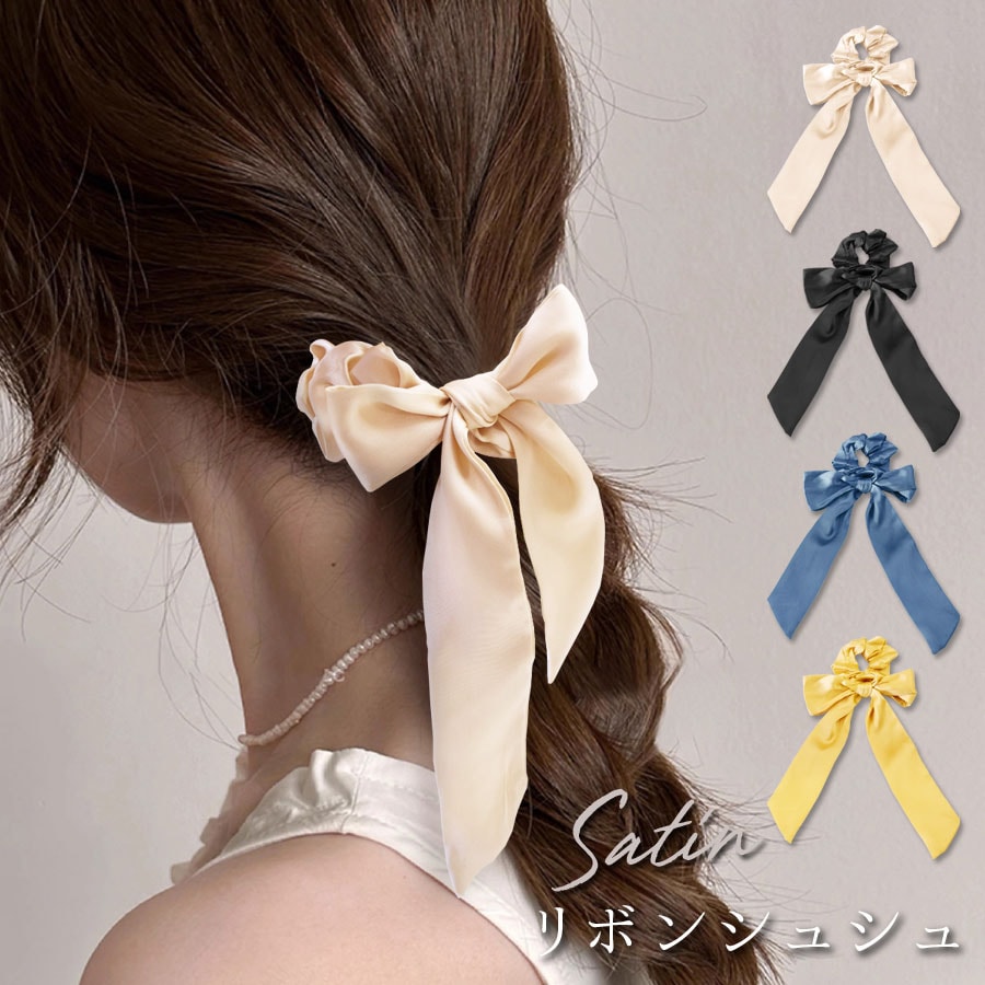 リボン シュシュ リボンシュシュ ロングリボン サテン 光沢 ツヤ ヘアゴム 髪ゴム レディース 【送料pt100】