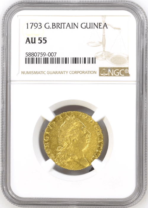 【動画あり】グレートブリテン 1793年 ジョージ3世 1ギニー金貨 NGC-AU55