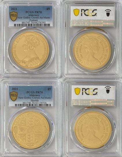 【即納商品】2枚組イギリスの王室属領オルダニー島エリザベス II 2021年5ポンドマットプルーフ金貨ニューゴシッククラウンPCG...