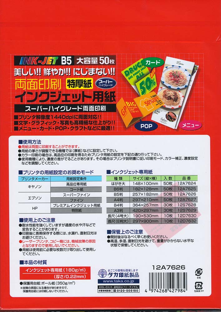 ササガワ 12A7626 インクジェット専用紙 B5判50枚