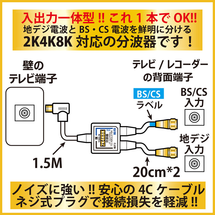 TARO\'S アンテナ分波器 入力/出力一体型ケーブル付き 4K8K放送(3224MHz)/BS/CS/地デジ/CATV 対応 ...