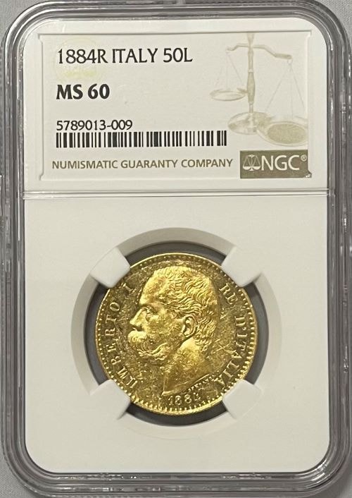 【動画あり】【レア度1-R1】イタリア 1884R年 ウンベルト1世 50リラ金貨NGC-MS60