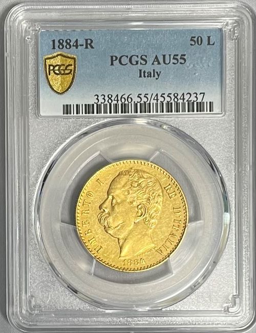 【動画あり】【レア度1-R1】イタリア 1884-R年 ウンベルト1世 50リラ金貨 PCGS-AU55