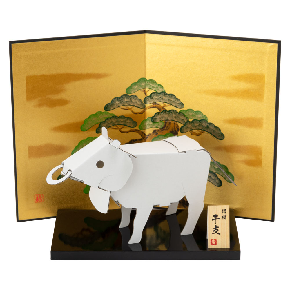 ダンボール干支工作キット 丑(牛) 黒塗り台+屏風セット のりもはさみも使わずに組み立てられるペーパークラフト Cardboard...
