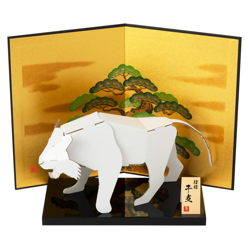 ダンボール干支工作キット 寅(虎) 令和四年(2022年) 黒塗り台+屏風セット のりもはさみも使わずに組み立てられるペーパークラ...