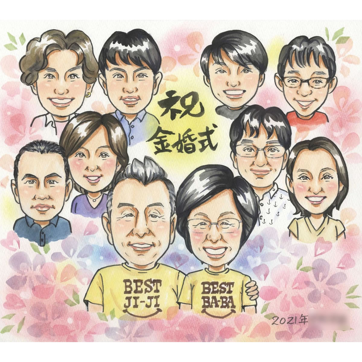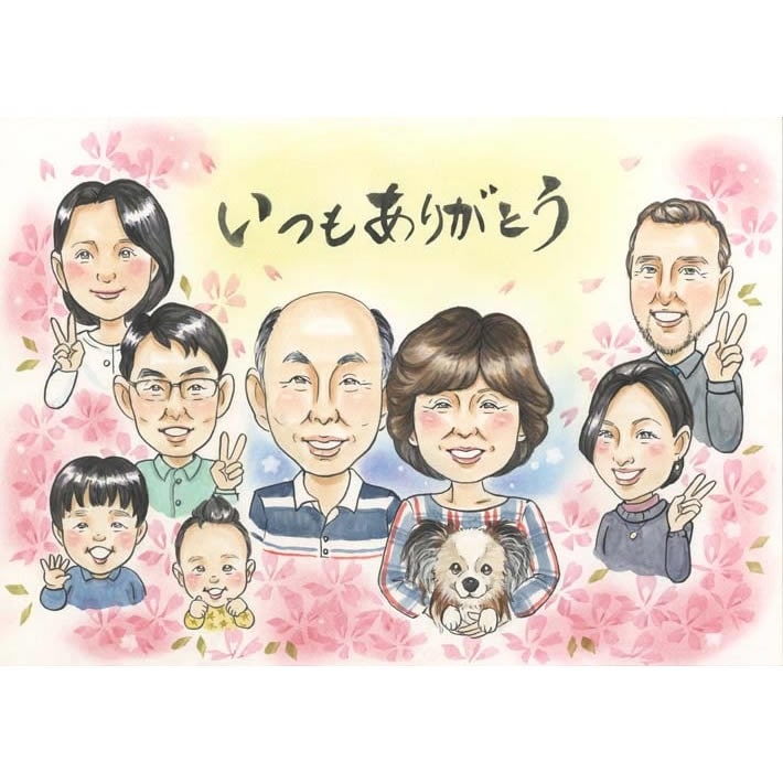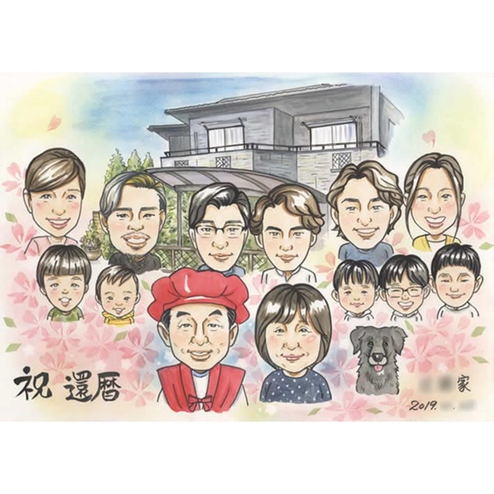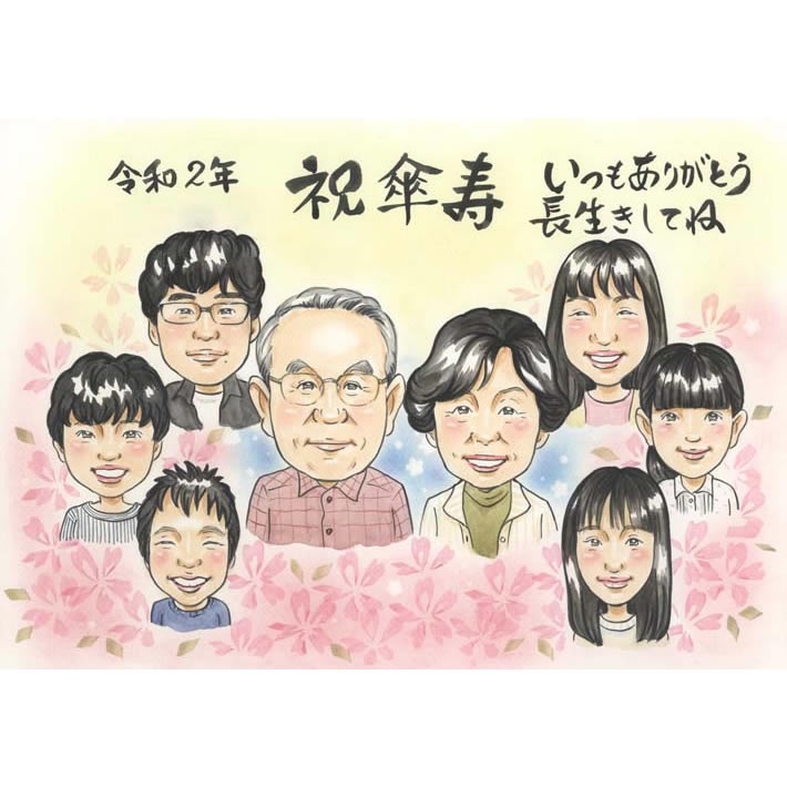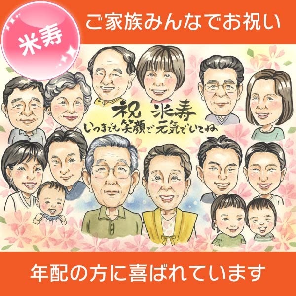 米寿を家族で祝う似顔絵 子供、孫、ひ孫、亡くなった方も一緒に家族全員集合の似顔絵 COSMOS 還暦祝い 古希祝い 喜寿祝い 傘寿...