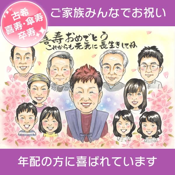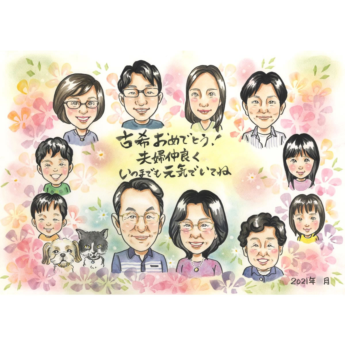 祝古稀 いつもありがとう似顔絵 子供や孫に囲まれたしあわせいっぱいの似顔絵。70歳のお祝いをあたたかくお祝いします。 COSMOS...