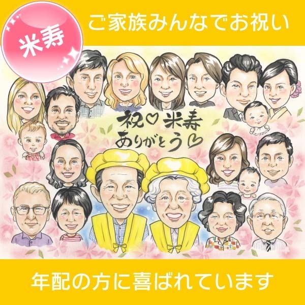 80歳のおばあちゃん、おじいちゃんへの感謝を伝える傘寿似顔絵ギフト 80歳傘寿祝いの思い出に!家族と一緒の似顔絵ギフト