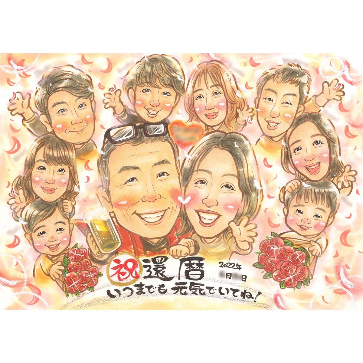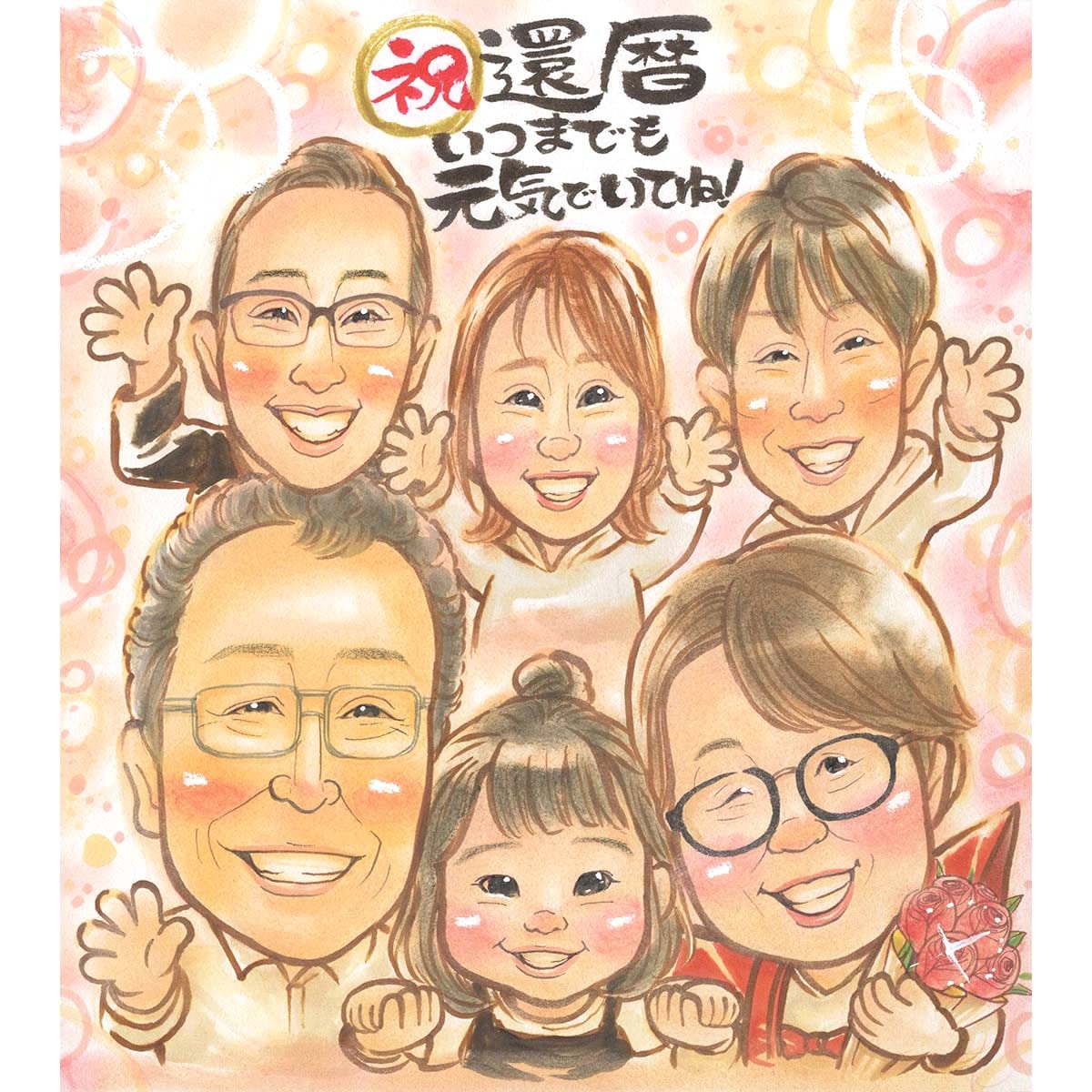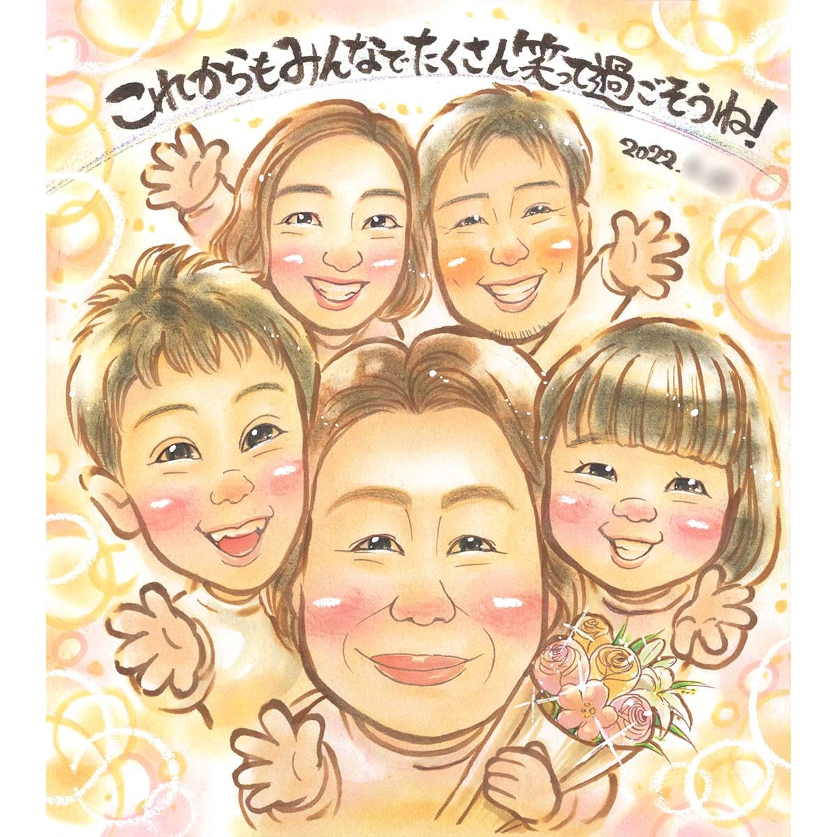 家族全員集合で描く還暦似顔絵ギフト 世代を超える思い出、子供から両親への似顔絵 世界にひとつだけのイラスト色紙ギフト 感謝の気持ち...