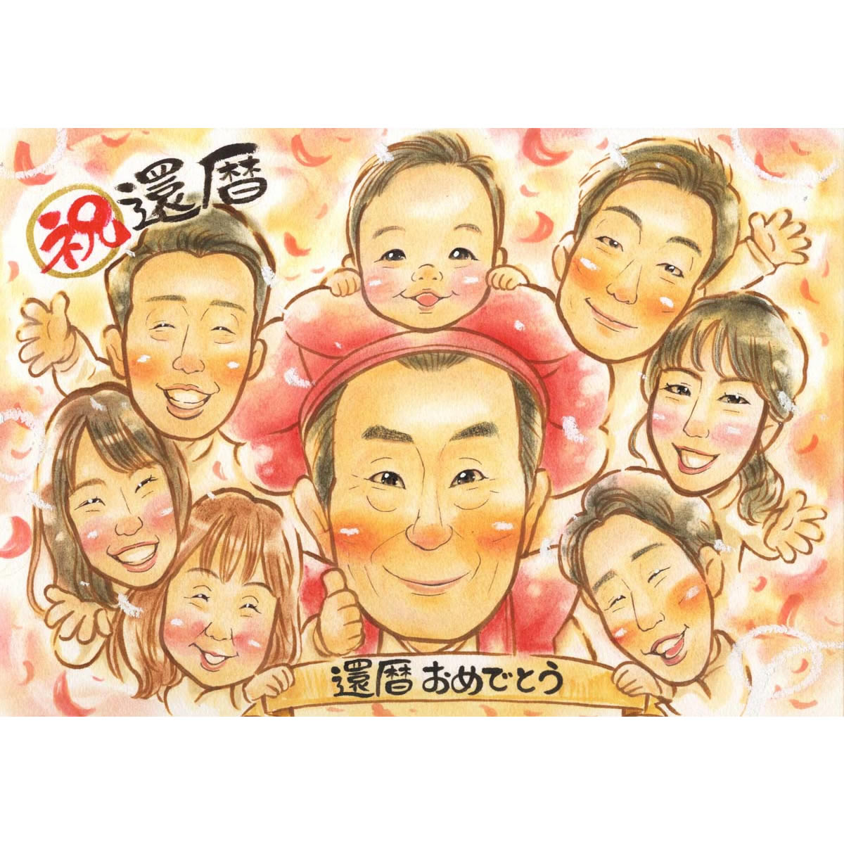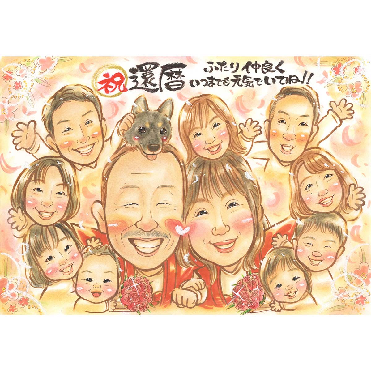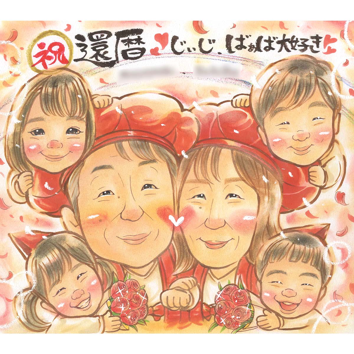 家族全員集合で描く還暦似顔絵ギフト 世代を超える思い出、子供から両親への似顔絵 世界にひとつだけのイラスト色紙ギフト 感謝の気持ち...