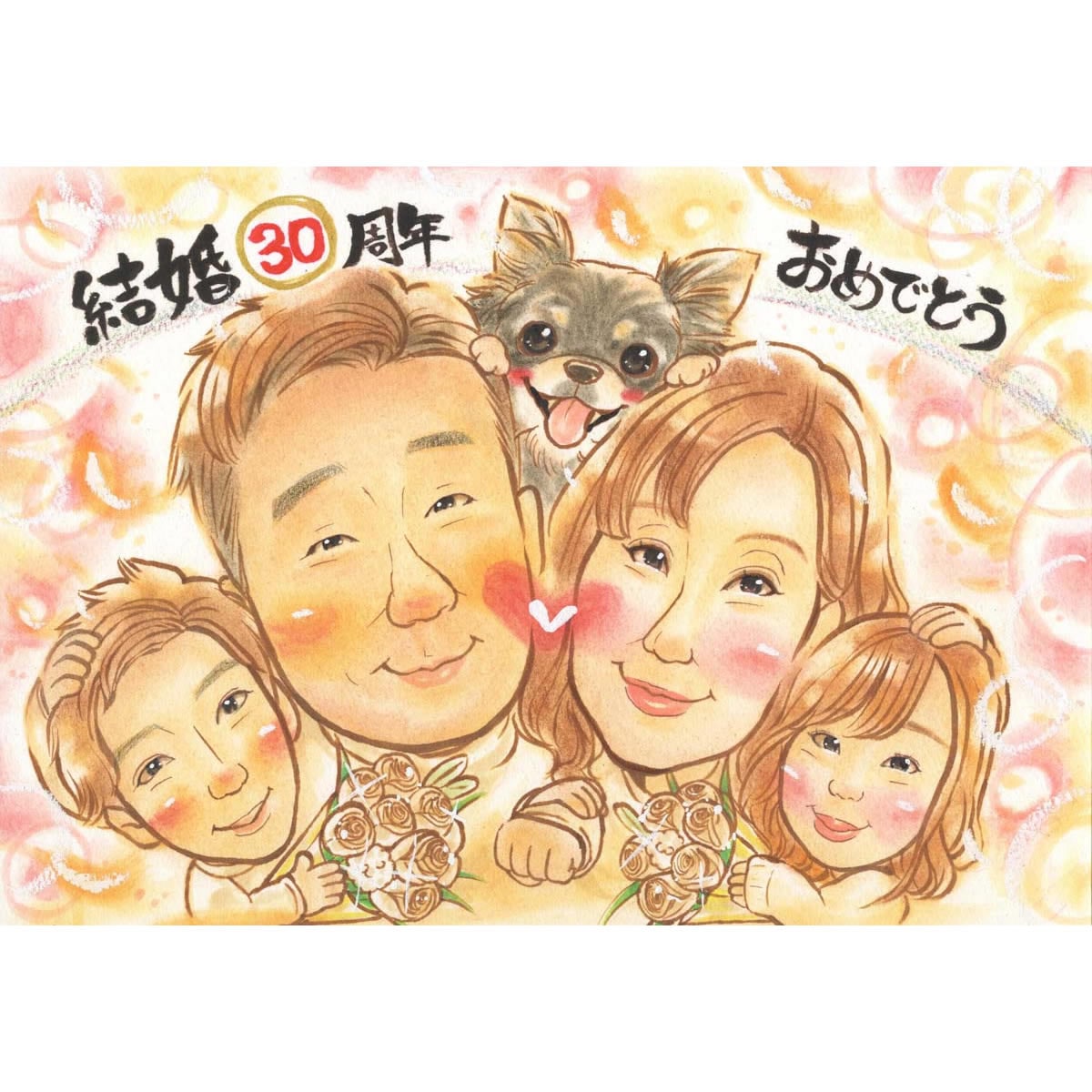 家族みんなが幸せな記念日になる似顔絵プレゼント 結婚40周年に柴犬や猫、ウサギなどペットも一緒に描けます 愛犬や愛猫、ハムスターや...
