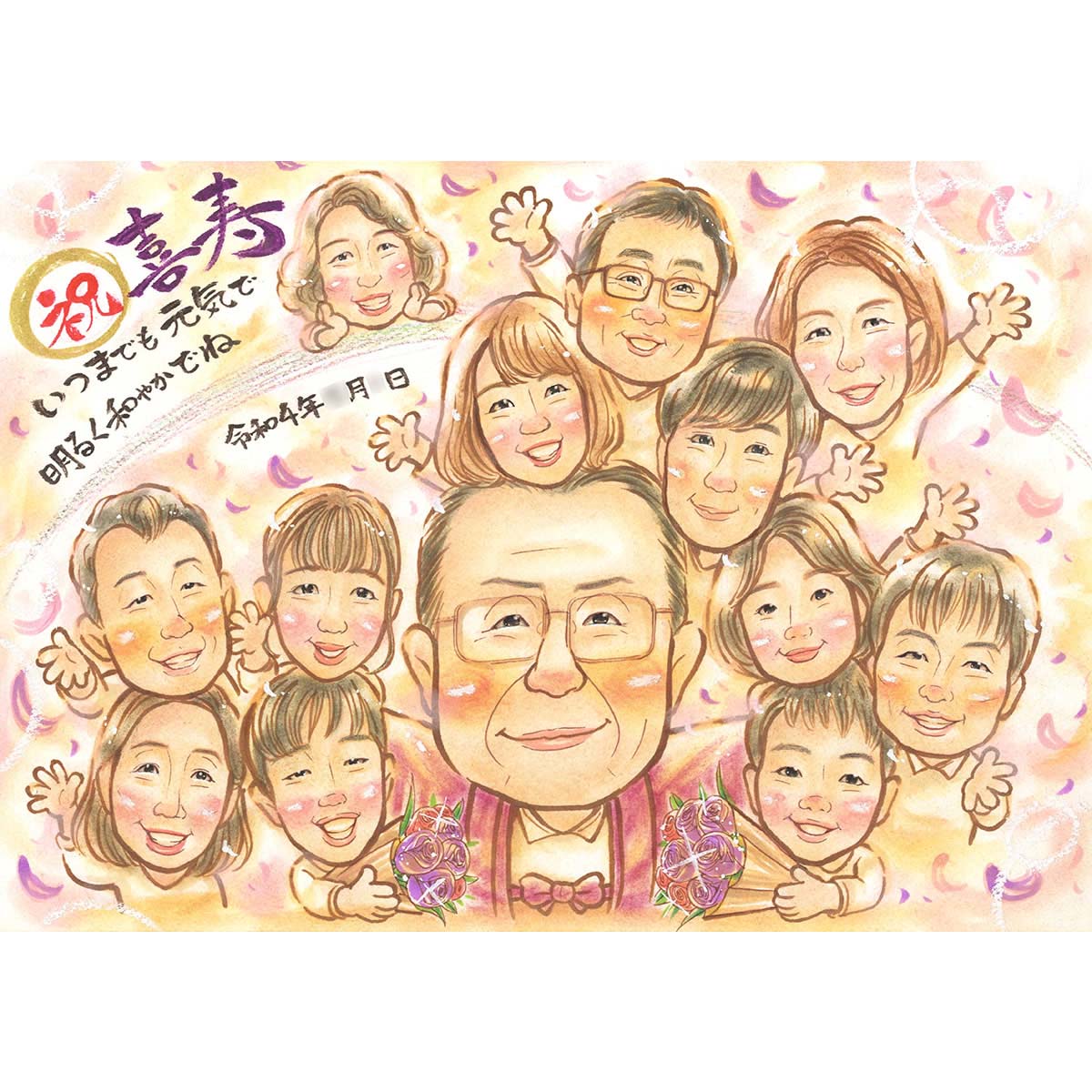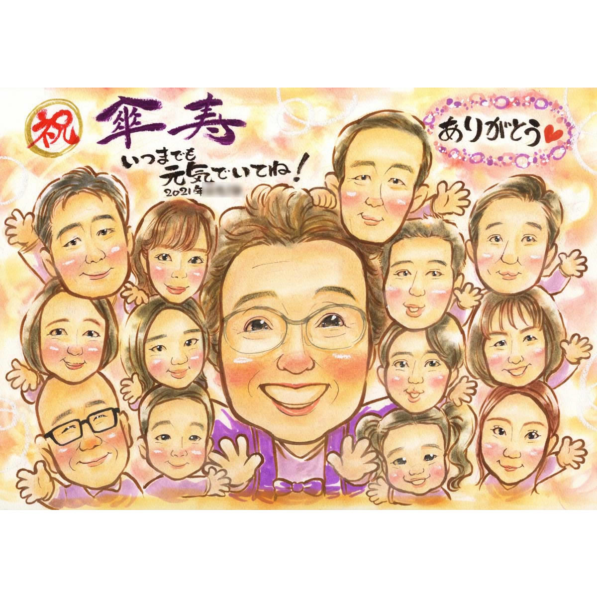 一点物の家族全員集合似顔絵 大人数の還暦や古希、米寿などのお祝いにぴったり 手描きでオリジナル感を演出 贈り物やギフトにも最適 百...