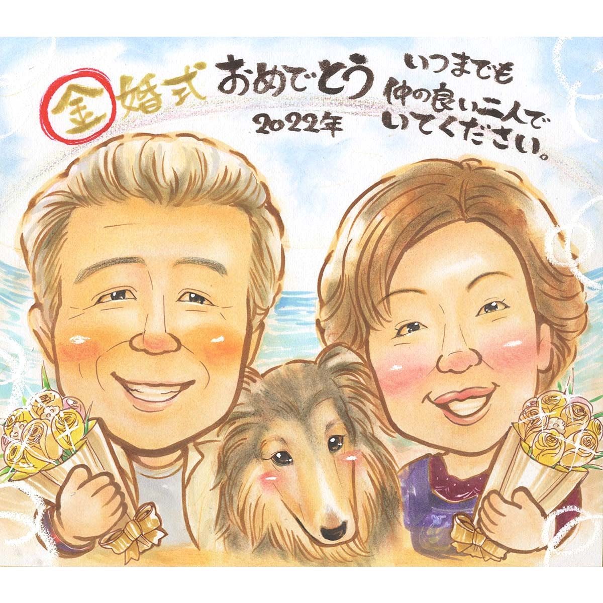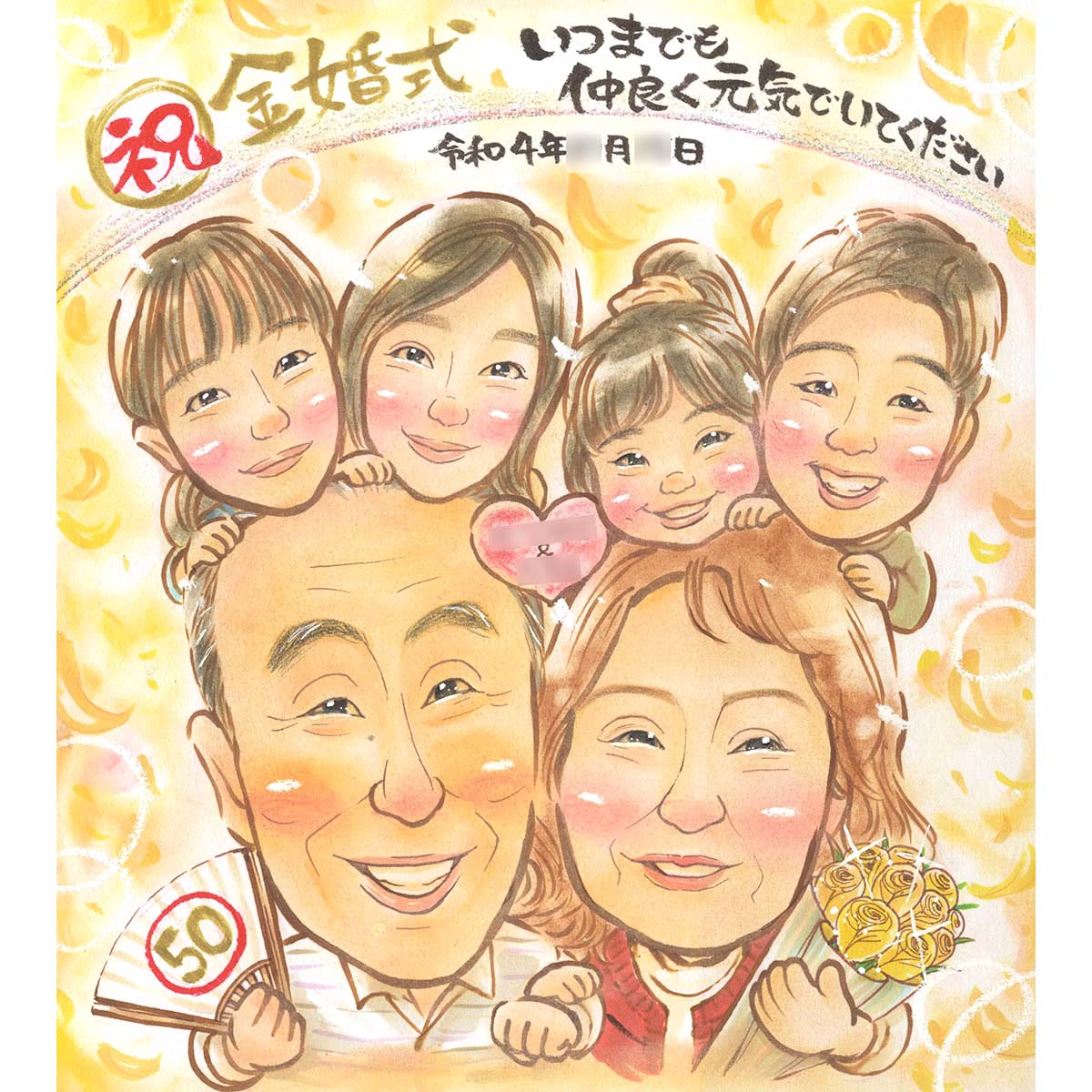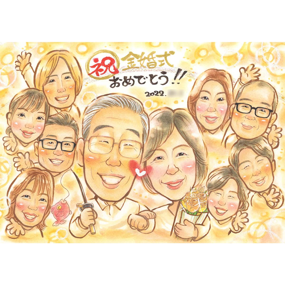 祝金婚式おめでとう似顔絵 ご両親の結婚50周年を家族みんなの似顔絵でお祝い