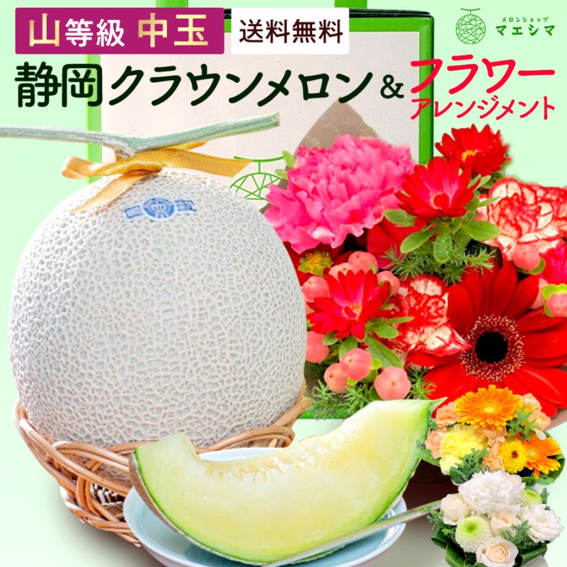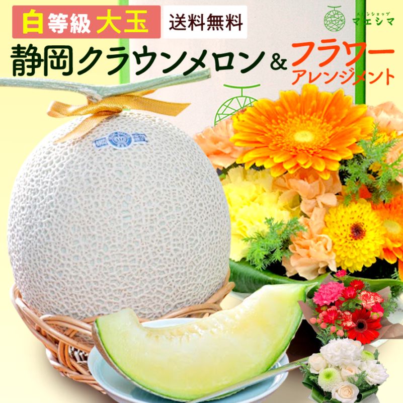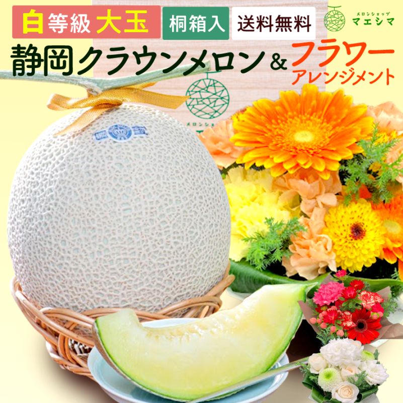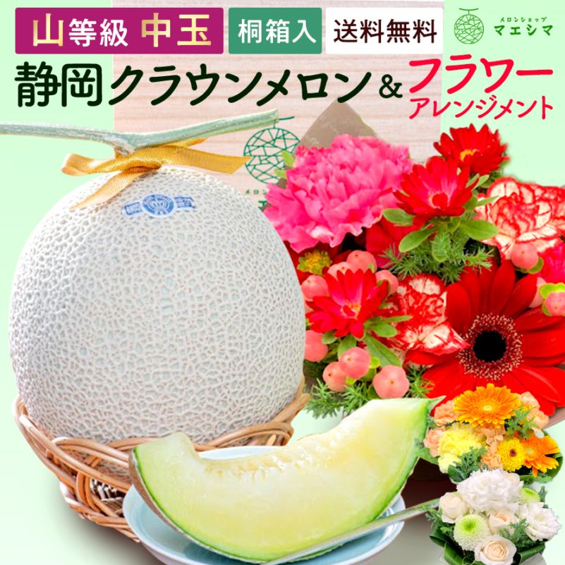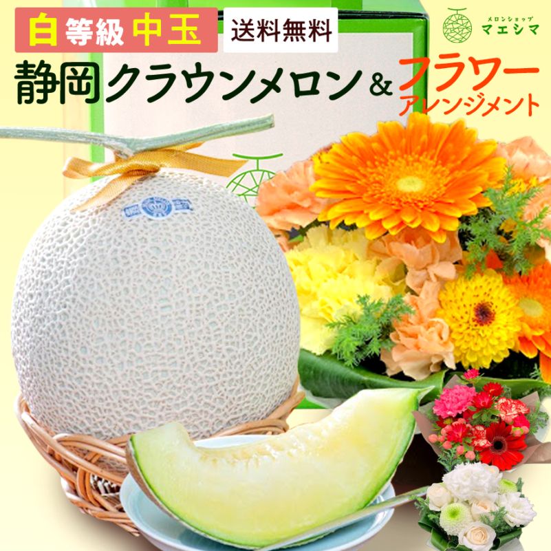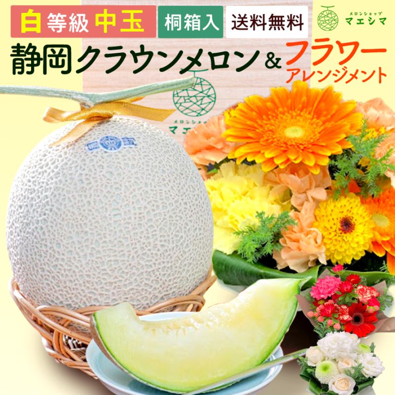 クラウンメロン+フラワーアレンジメントセット 【並(白等級)】中玉(1.3kg前後)1玉入り