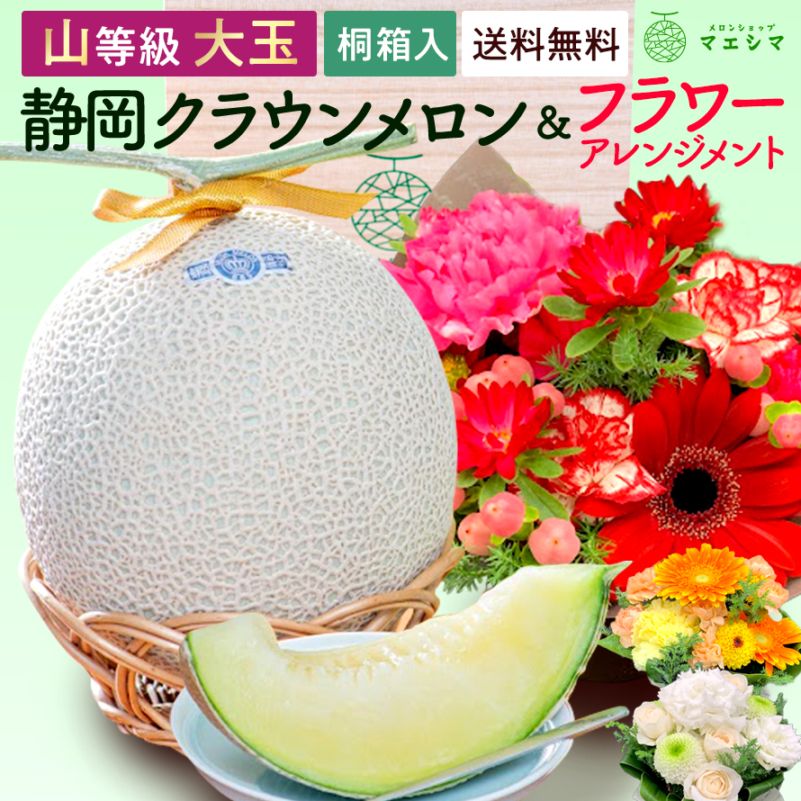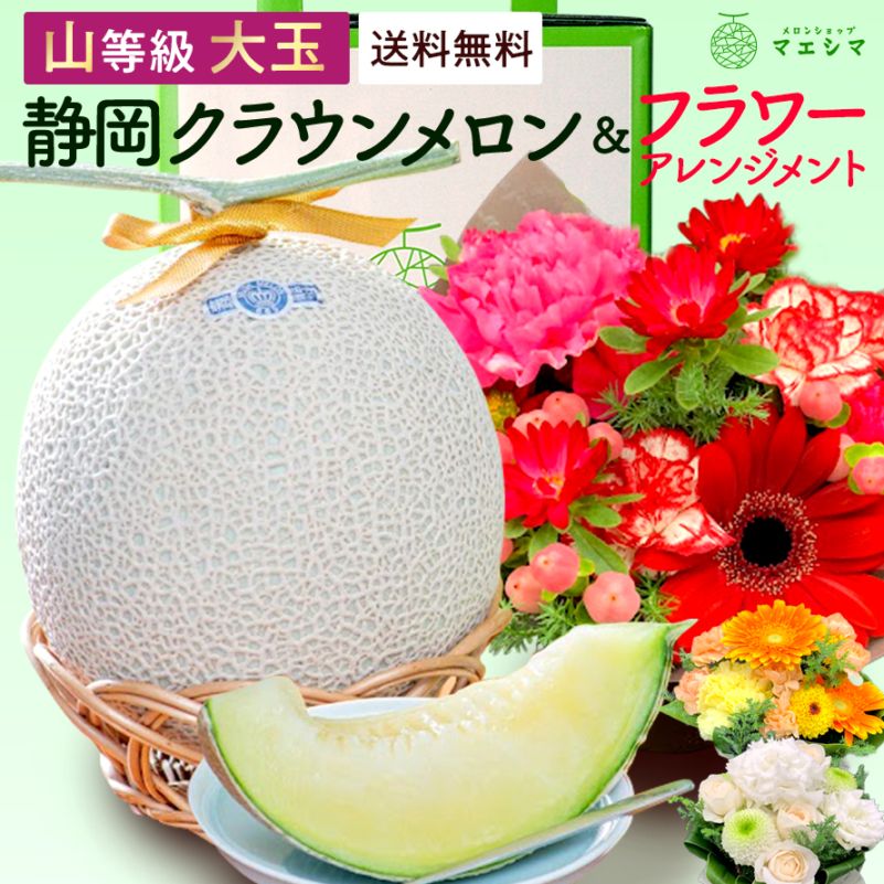 クラウンメロン+フラワーアレンジメントセット 【上(山等級)】大玉(1.4kg前後)1玉入り