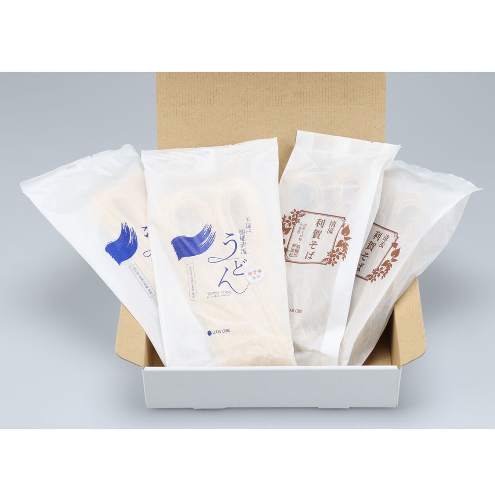 グラスキューブ「清流利賀そば・国産小麦 能登塩使用 手延べ極細清流うどん 各2袋入簡易包装セット」