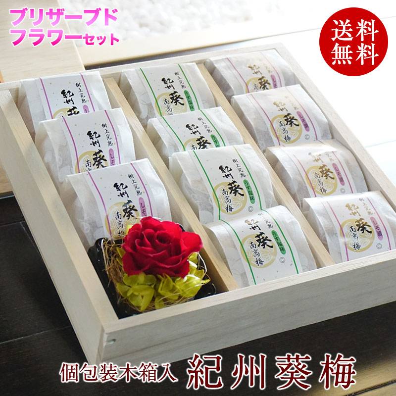 内祝い ギフト 紀州葵梅 個包装11粒&国産ブリザーブドフラワー付 木箱入ギフト。送料無料 ※一北海道、沖縄を除く低塩味梅、しそ漬...