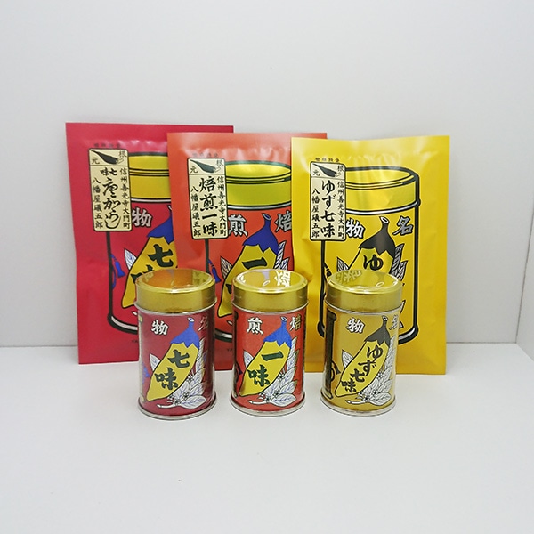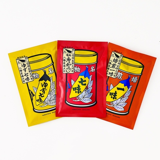 八幡屋礒五郎七味唐辛子3種(七味唐からし、ゆず七味、焙煎一味)袋(信州長野県善光寺のお土産七味唐がらし)