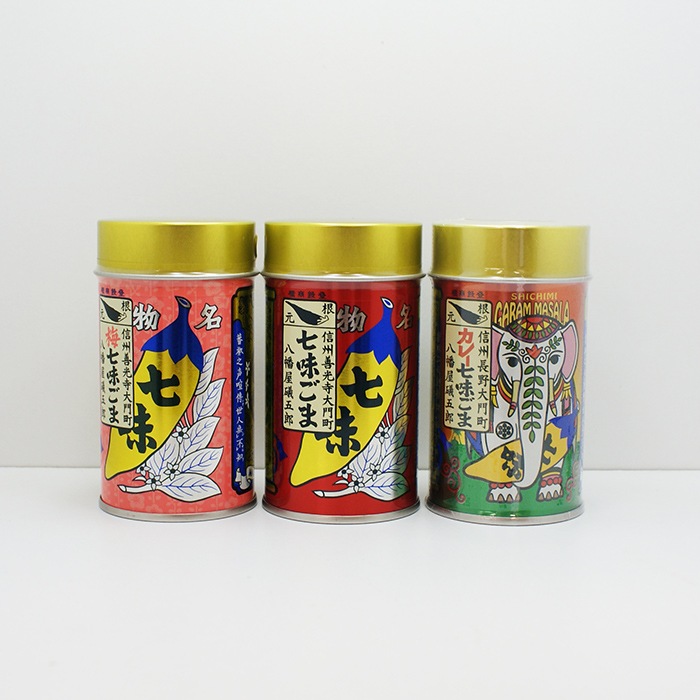 八幡屋礒五郎七味ごま缶+カレー七味ごま缶+梅七味ごま缶の3種セット